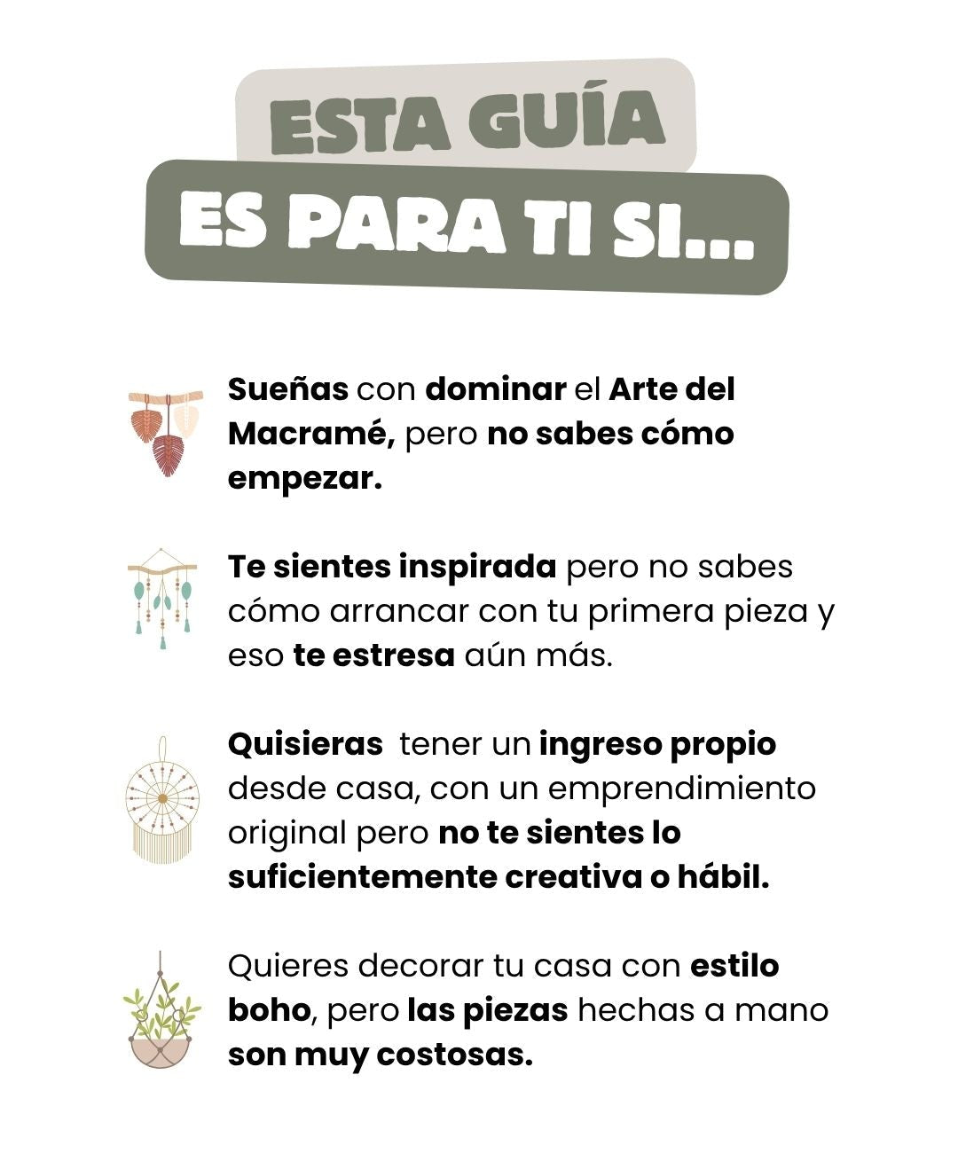 Esta guía no solo es para quienes ya saben hacer piezas en Macramé y obtengan nuevos patrones, fue creada para Principiantes y para que descubras el arte del Macramé sin miedo a equivocarte, porque desarrolla la creatividad.