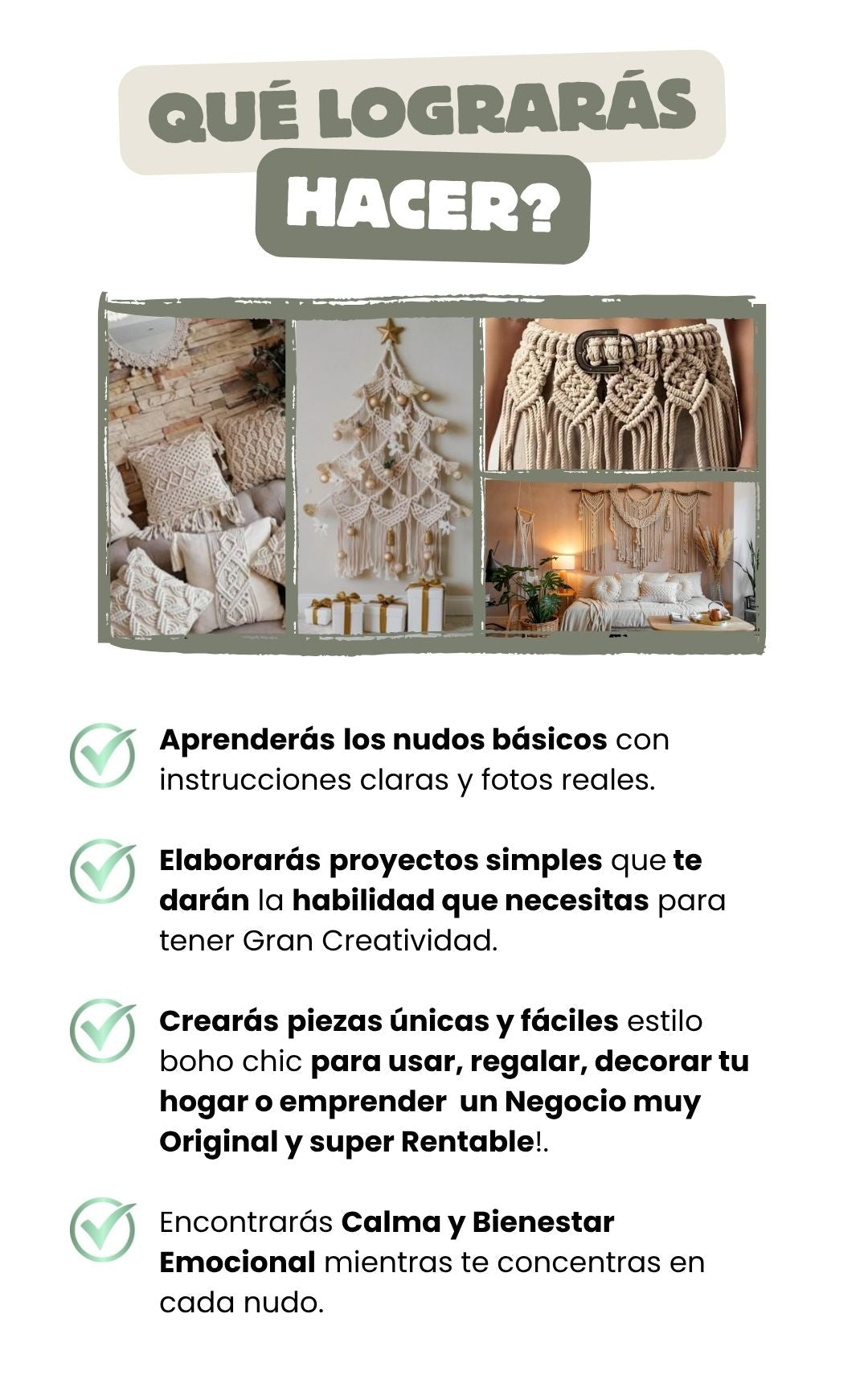 Esta guía fue pensada para principiantes absolutos. Aprenderás paso a paso los nudos, cómo cortar las cuerdas y cómo lograr tu primer proyecto en tan solo 2 horas luego que tengas el material.